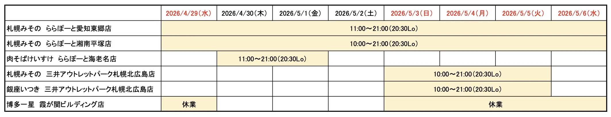 ゴールデンウィーク期間中、下記の通り営業時間を変更させて頂きます。